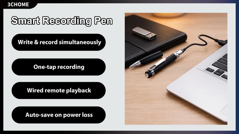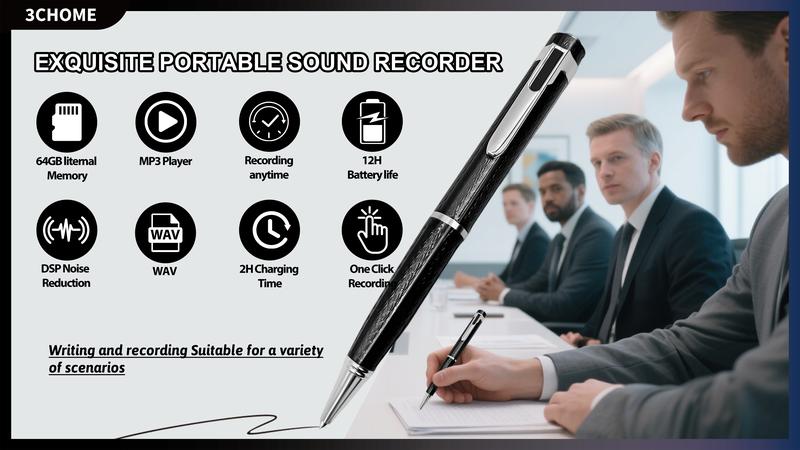 A multifunctional smart digital pen combining premium writing performance with high-quality audio recording. Designed with a sleek carbon-fiber texture, this recorder pen delivers HD WAV audio, DSP noise reduction, and one-tap recording for quick, discreet use in meetings, lectures, and interviews.